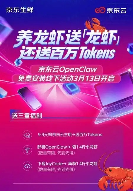 同时线上也能参与“养龙虾送龙虾”,3月13日0点至24点,登录京东云官网购买云主机并部署OpenClaw,即有机会赢取小龙虾一份。新用户登录京东云JoyCode智能编码助手,还可额外领取一份小龙虾。