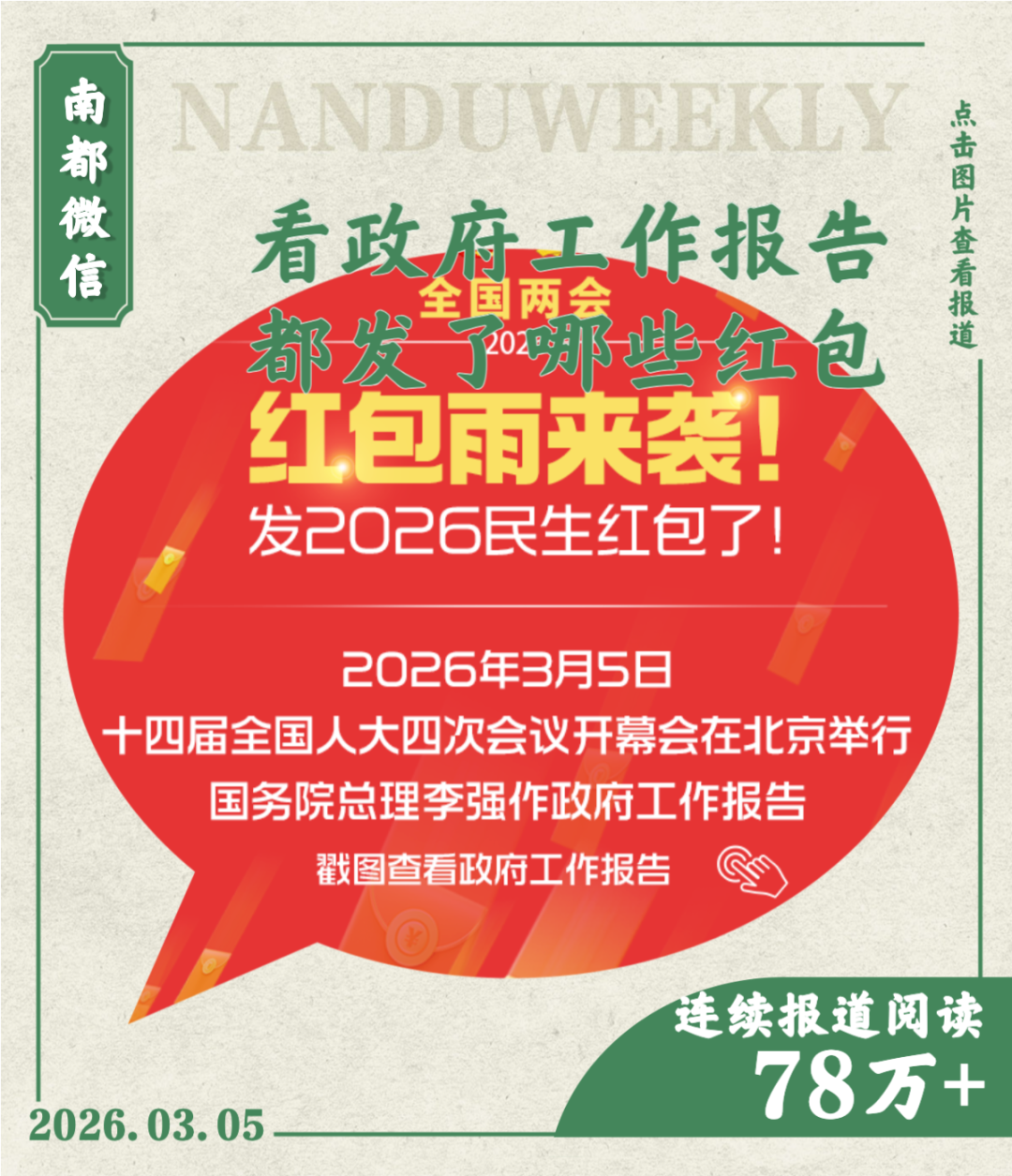 3月5日,李强总理向十四届全国人大四次会议作政府工作报告。南都官微第一时间跟进报道,从政府工作报告中抽取14个民生热点,以创意互动方式拆解政府工作报告中的利民“红包”。系列报道在南都微信阅读量超78万。