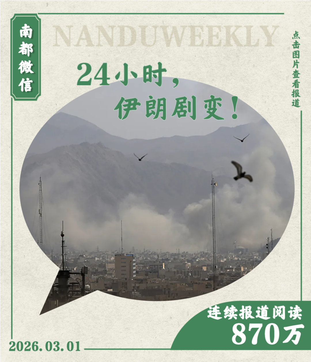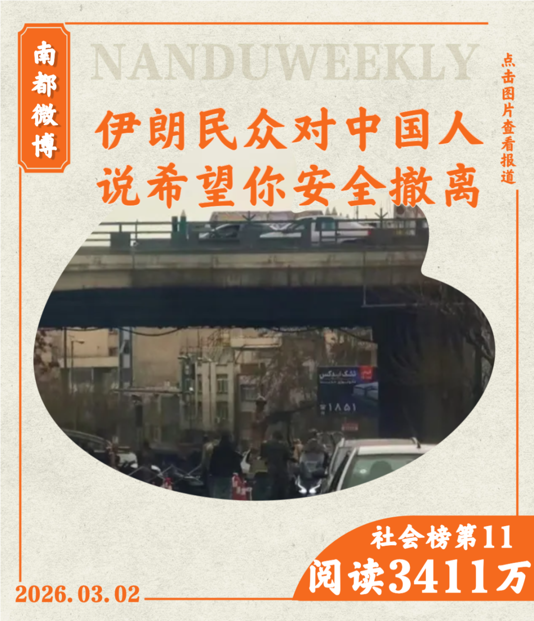 系列报道引发广泛关注,文字报道在南都微信阅读量超870万。原创报道《连线在伊朗的中国人:采购物资的人特别多,收到使馆安全提醒》,登上腾讯新闻热榜第4;话题“伊朗民众对中国人说希望你安全撤离”登上新浪微博社会榜第11位,阅读量3408万。