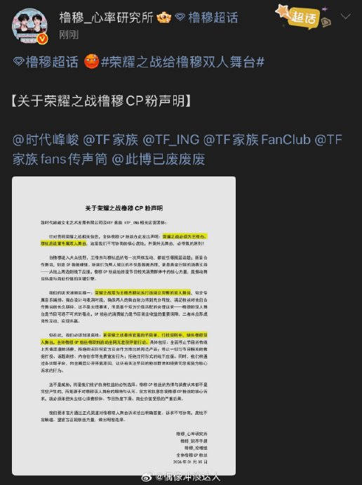 最近饭圈炸开了锅——TF家族王橹杰和穆祉丞的CP粉甩出一份维权声明,直接喊话经纪公司时代峰峻。这群被称为“橹穆批”的粉丝可不是闹着玩的,手里攥着3500万的消费凭证,从专辑购买到周边打投,每一笔都清清楚楚。他们列出的七项诉求里,既有“恢复双人舞台周边单链”这种实际要求,也有“明确双人发展规划”这样的长远呼吁。要知道,这对CP去年靠着合作舞台圈粉无数,粉丝砸钱的时候眼睛都没眨,现在却发现正主同框镜头被一剪没,换谁能忍?